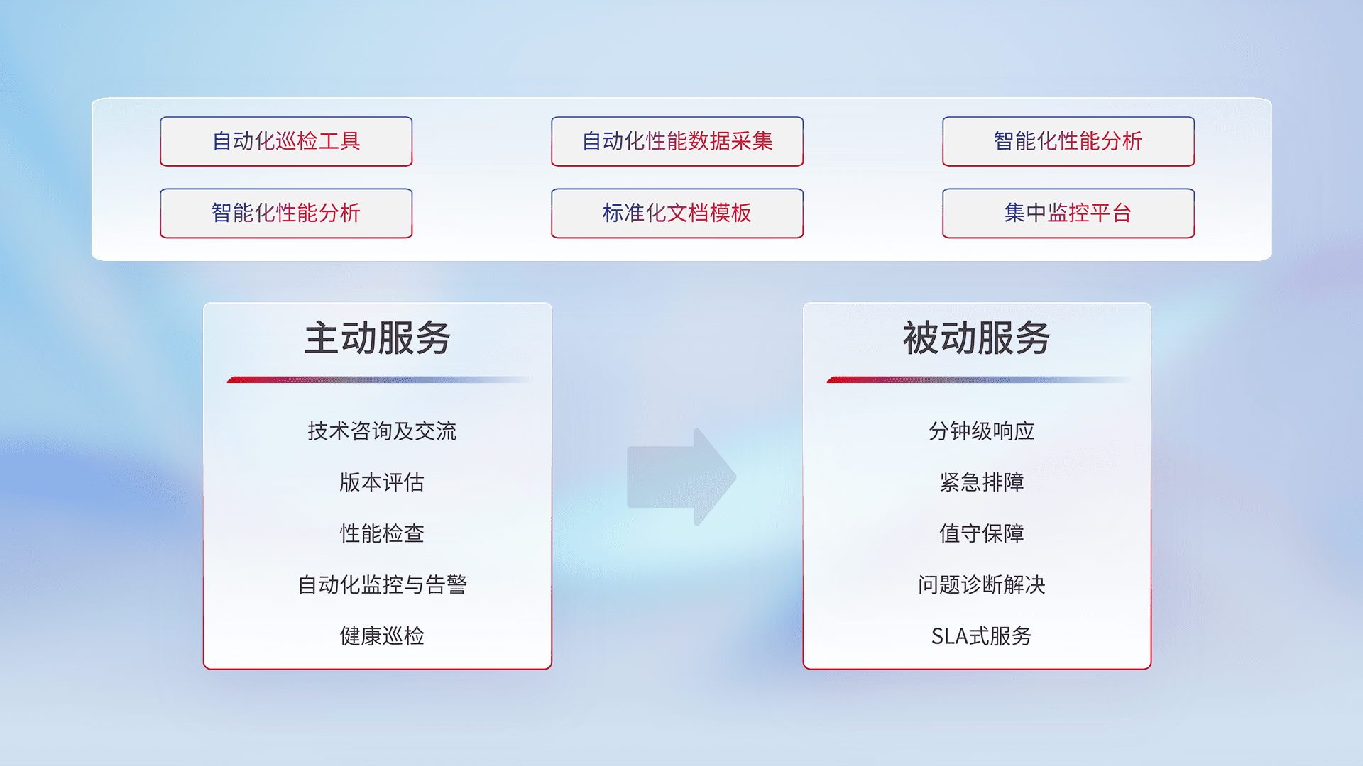 智能化工具和标准化文档,,保障服务质量,,,,提供主动服务(包含技术咨询、、版本评估、、、性能检查、、自动化监控与告警、、健康巡检)和被动服务包含(分钟级响应、、、紧急排障、、、、值守保障、、、问题诊断解决、、SLA服务)。。