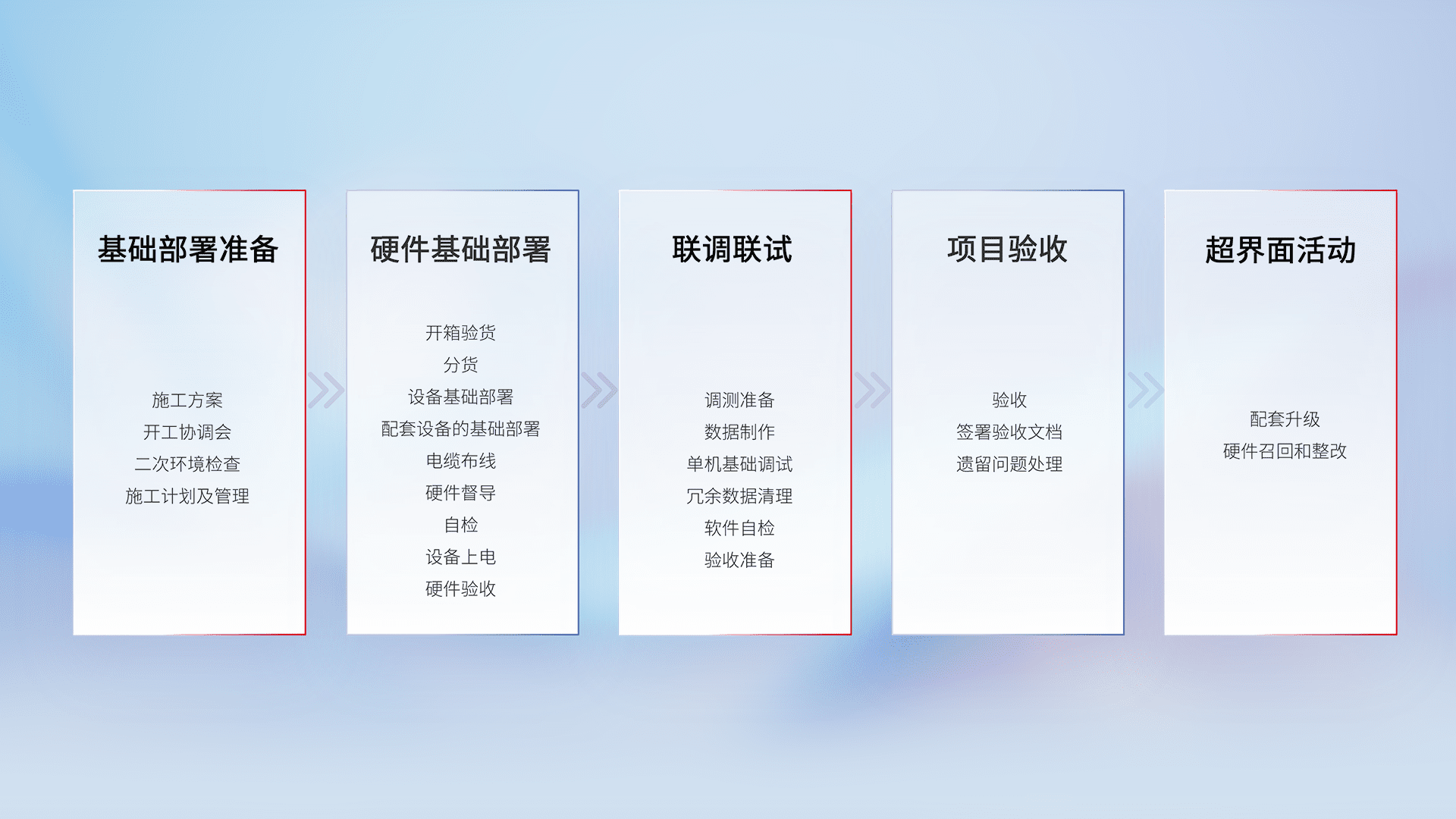 从基础部署准备、、、硬件基础部署、、、联调联试、、、项目验收、、、、越界面活动的全过程可追溯,,,保证施工质量和进度。。